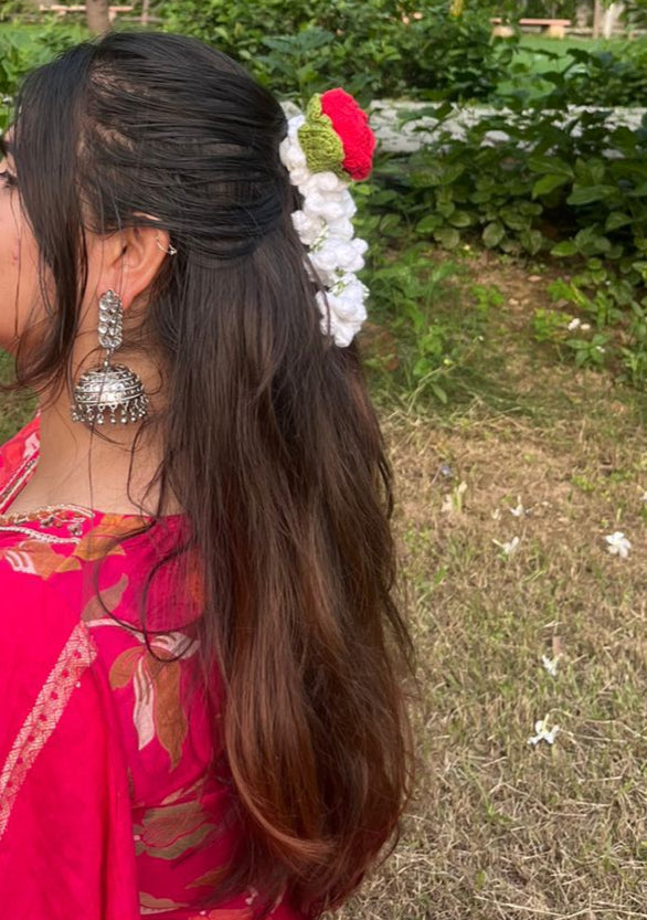 Our Rose Drop Gajra is designed to add a graceful touch to your hairstyle. With a rose at the centre and elegant hanging strands, it beautifully enhances buns, ponytails, or braids. A perfect pick for weddings, festive occasions, and traditional looks โ this gajra is all about timeless floral elegance. ๐นโจ